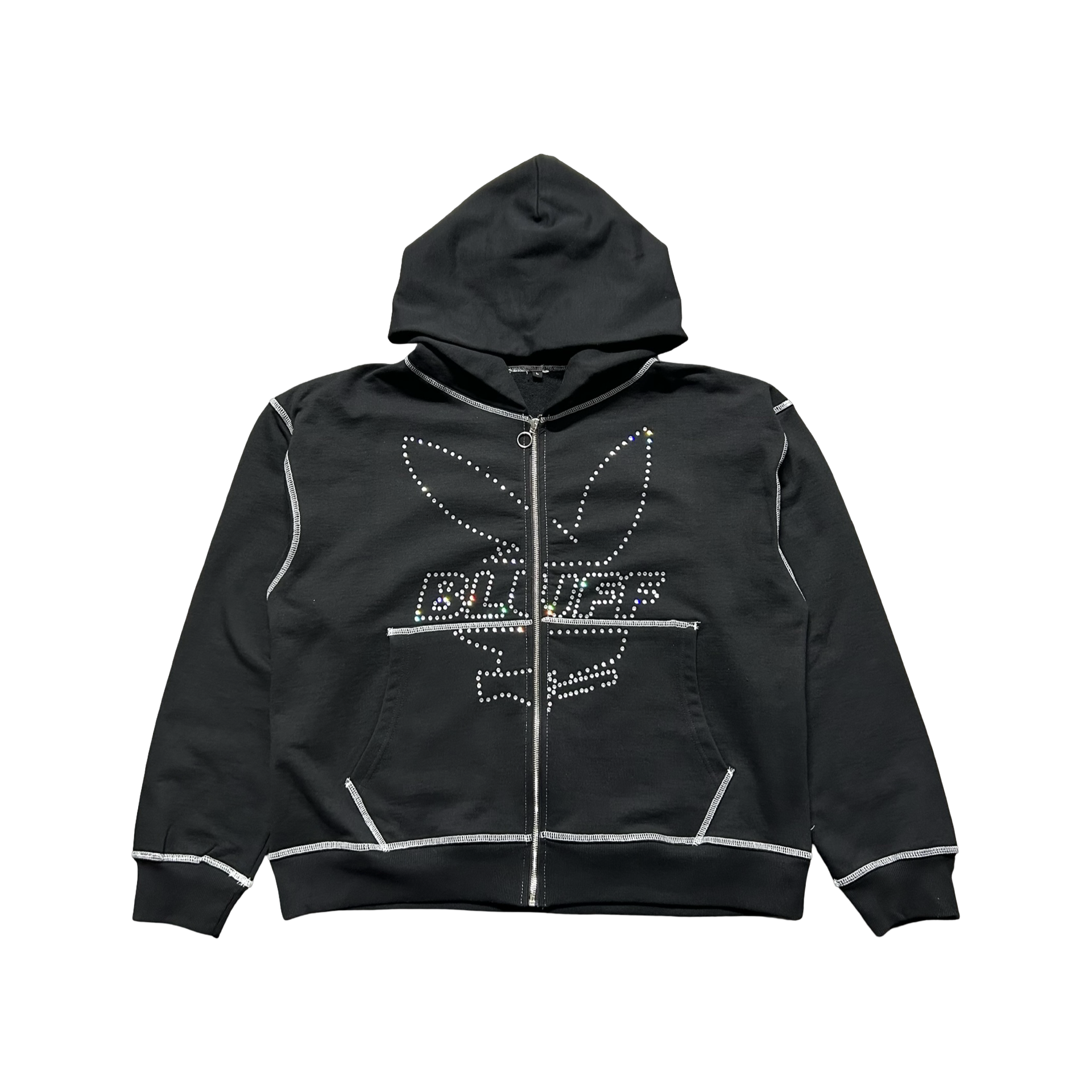 Premium heavyweight zip-up hoodie featuring a bold rhinestone bunny graphic. Soft fleece interior, durable build, and clean unisex fit.
